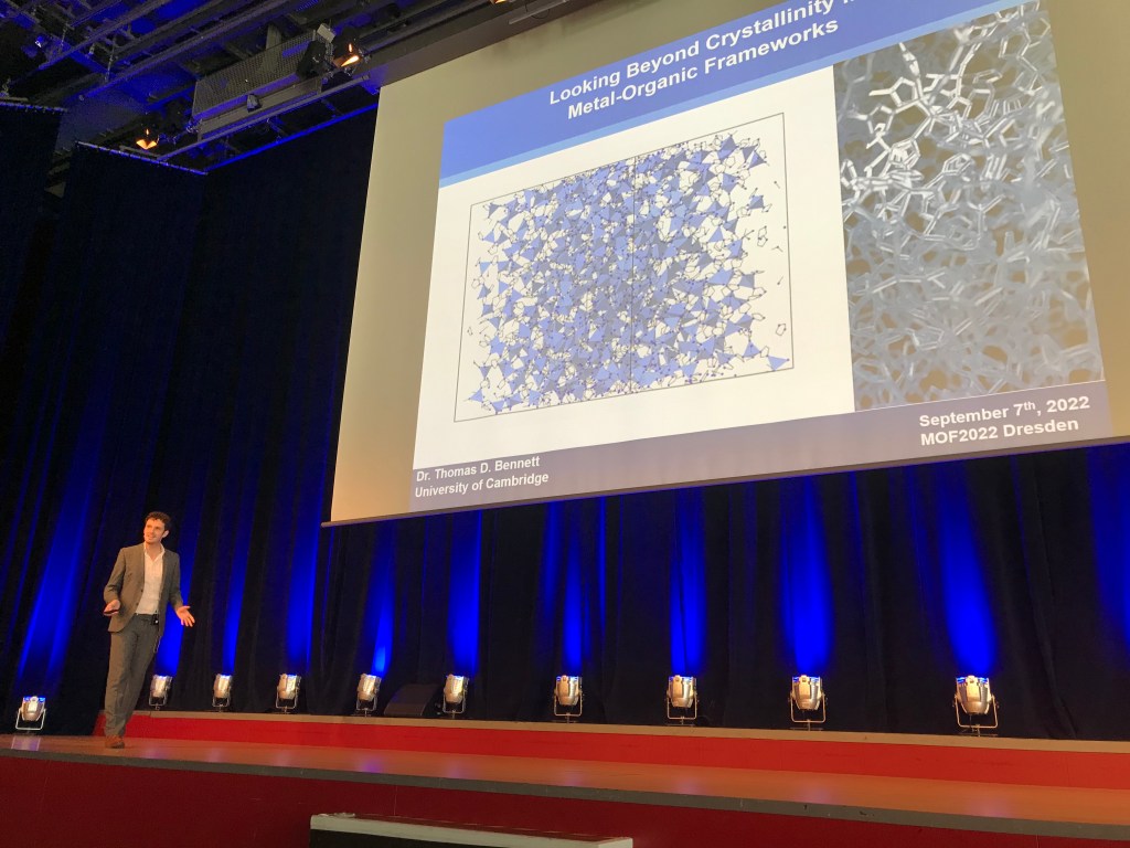A 3 year Research Fellowship at Trinity Hall, University of Cambridge followed, alongside lecturing some of the 1B Materials Chemistry course at the department. He started a Royal Society University Research Fellowship in 2016, along with a visiting adjunct professor position at The Wuhan University of Technology and a visiting scientist position at CSIRO Melbourne. The research group is best known for the discovery of hybrid melt-quenched glasses, and seminal works exploring the interface of the coordination polymer, MOF and glass domains. The group have considerable expertise in the characterisation of amorphous solids and liquids, and in creating new classes of functional material. For a taste of the research performed by the group, have a look at Tom’s plenary lecture at the International MOF Conference in 2022 here.